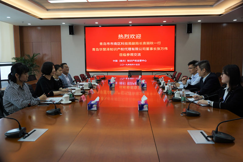 2019年4月15日,青島市市南區(qū)科技局副局長(zhǎng)袁麗秋一行到中國(guó)(南方)知識(shí)產(chǎn)權(quán)運(yùn)營(yíng)中心參觀調(diào)研,并與南方中心張衛(wèi)光副總裁等座談交流,青島華慧澤知識(shí)產(chǎn)權(quán)代理有限公司董事長(zhǎng)張萬(wàn)偉一同參加。