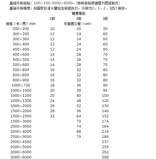 基礎(chǔ)平板材質(zhì):高強(qiáng)度鑄鐵HT200-300工作面硬度為HB170-240,經(jīng)過兩次人工處理(人工退火600度-700度和震動時(shí)效)使用該產(chǎn)品的精度穩(wěn)定,耐磨性能好。
